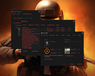 30 скинов оружия из CS:GO, красные модели террористов и синие модели спецназа, синяя полупрозрачная тема меню с зелеными элементами и ещё три дополнения