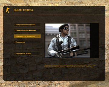 27 золотых моделей оружия из Counter-Strike: Source, черная тема меню с желтыми элементами, фон со спецназом GSG9...